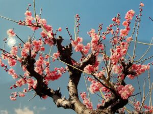 平年の何倍もの大雪に見舞われた日本海側の人達に申し訳ない様な 快晴の一日 きれいな梅の花が青空に映えていました。